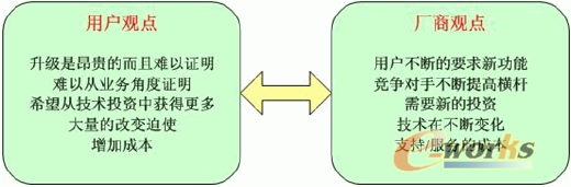 從用戶的角度出發,用戶認為軟件升級需要不斷的增加成本,而相對應的效益卻是難以衡量的。同時對于企業CIO來說,不可能像升級WINDOS操作系統一樣簡單實施ERP產品的升級,他們不得不考慮系統升級給企業在工作量、升級繁簡程度和人員安排、實施風險等各方面問題。