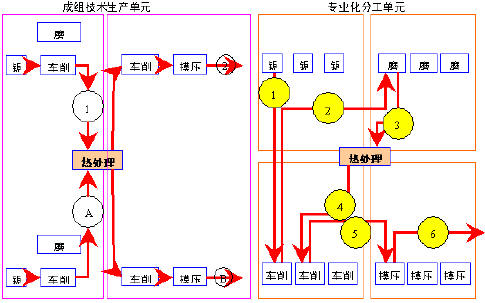 成組技術法(group technology):類似的零部件被分成一組,生產這些零部件的工作由一個專門的工作單元負責。與將工作從下一個部門轉移到另一個部門交給專業員工操作不同。如圖2就顯示了兩種布局方式的不同:一種是將生產一種零部件的所有機器組成一個工作中心;另一種是按部門進行布局。成組技術單元減少了不同操作之間的移動、等待時間和在制品庫存,也減少了所需雇員的人數。體現了日式生產管理方法下消除浪費的指導思想。該方法雖然產生于美國,但其最成功的應用卻在日本。
