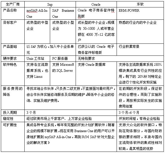 目前國內外各大知名廠商,如SAP、微軟、oracle、金蝶、用友、東軟等,已經開始關注中小企業的ERP市場,提出了各種面向中小型企業的解決方案。表1對德國SAP公司推出的mySAPAllInOne和SAPBusinessOne解決方案、美國Oracle公司的Oracle電子商務套件特別版、我國東軟公司的ERMPOWER解決方案作了一個簡單的比較。