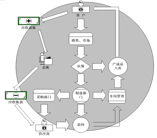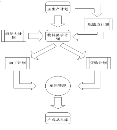 圖1的的流程簡單概述如下:客戶下訂單給企業的銷售部門,銷售部門與客戶確認定單,定單確定后銷售部門首先查看成品倉庫,如果成品庫中的數量可以滿足客戶的訂貨需求,就直接發貨給客戶,行成應收款,銷售過程基本完成。如果成品庫存不能滿足客戶訂單,銷售部門會把訂單下放到生產管理部門,生產管理部門負責做主生產計劃,經過粗能力審核,形成MRP,MRP生成采購計劃和自制計劃,采購計劃下放到采購部,采購部選擇合適的供應商,供應商提供原材料進入原材料庫;自制計劃經過細能力審核,進入車間任務系統,車間任務經過合理調節,進入車間作業系統,車間作業安排生產,進行能力調整,最后生成成品,經過質量檢驗,成品入庫。同時,在采購部形成應付款,在銷售部形成應收款,應收與應付自動分錄,進入總帳系統。