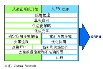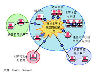 ERP最開始是一種應用策略,建立了一幅所有企業應用系統、商務流程的整合圖景,并不要求是單個供應商的策略。作為一種部署策略,ERP II也不排除采用單項應用的組合戰略。相反,它允許企業確定供應商的核心程度,以便符合企業流程的需求和通過ERP II自身具備的整合能力把單項應用也納入其中。