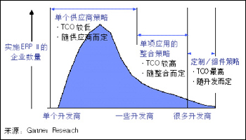 按照Gartner Group 預測,到2005年,采用單項方案組合獲得ERP II的企業的擁有成本至少比那些采用單個廠商成套產品的高出25%(發生概率為0.7)。