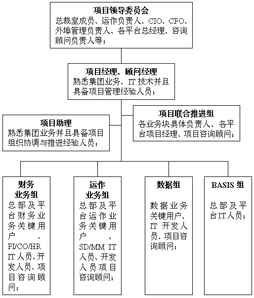 我們可以從這個組織結構圖看到,從項目領導委員會成員到項目聯合推進小組成員以及到各個功能小組的teamleader,都是各塊業務的層層領導者,他們才是這個項目的核心力量,也是這個項目的主人。由此可見,神州數碼的ERP項目是一個層層一把手參與的真真正正的一把手項目。